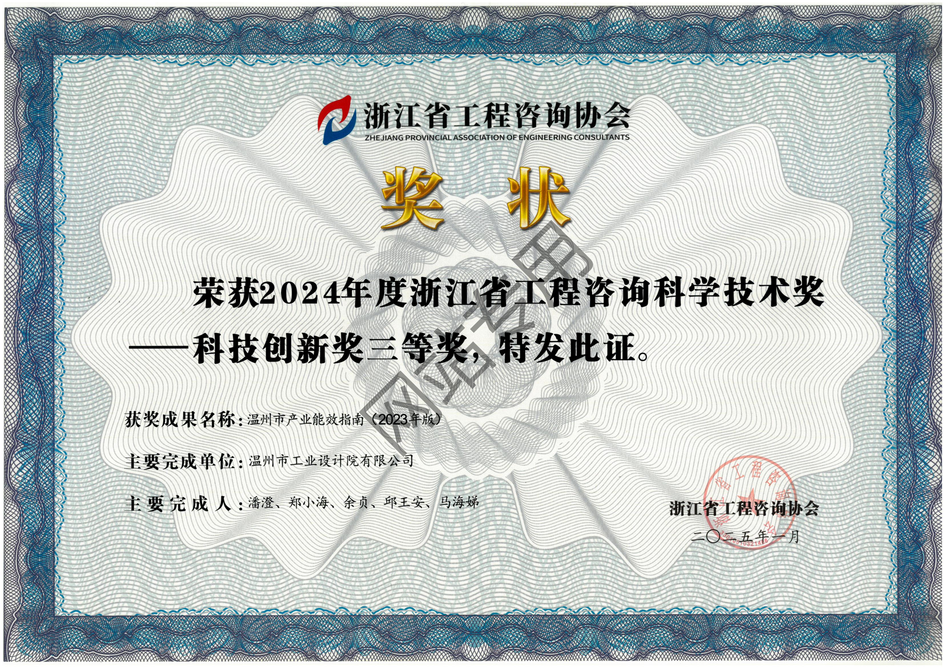 溫州市產(chǎn)業(yè)能效指南(2023年版)項目 2024年度省工程咨詢科學技術獎—科技創(chuàng)新獎獲獎三等獎