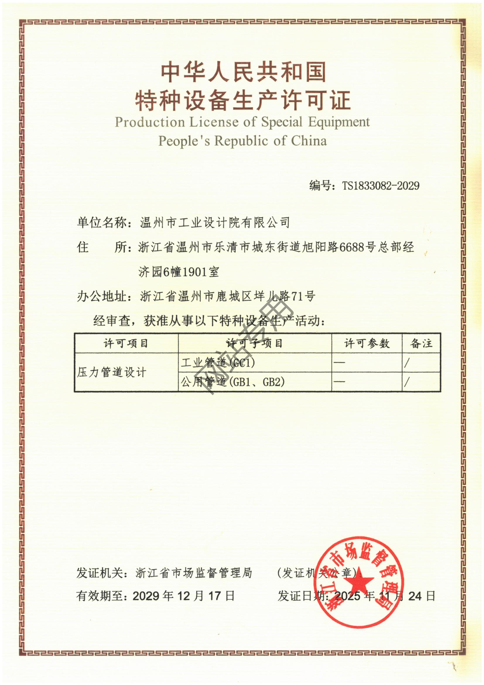 特種設(shè)備設(shè)計許可證壓力管道